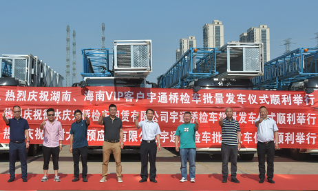 6月20日上午8點58分,湖南楊總、劉總,海口賴總、衡水王總、開封楊總、宇通重裝喬總等領導為本次交車儀式剪彩,共同見證宇通橋梁檢測車批量交付。